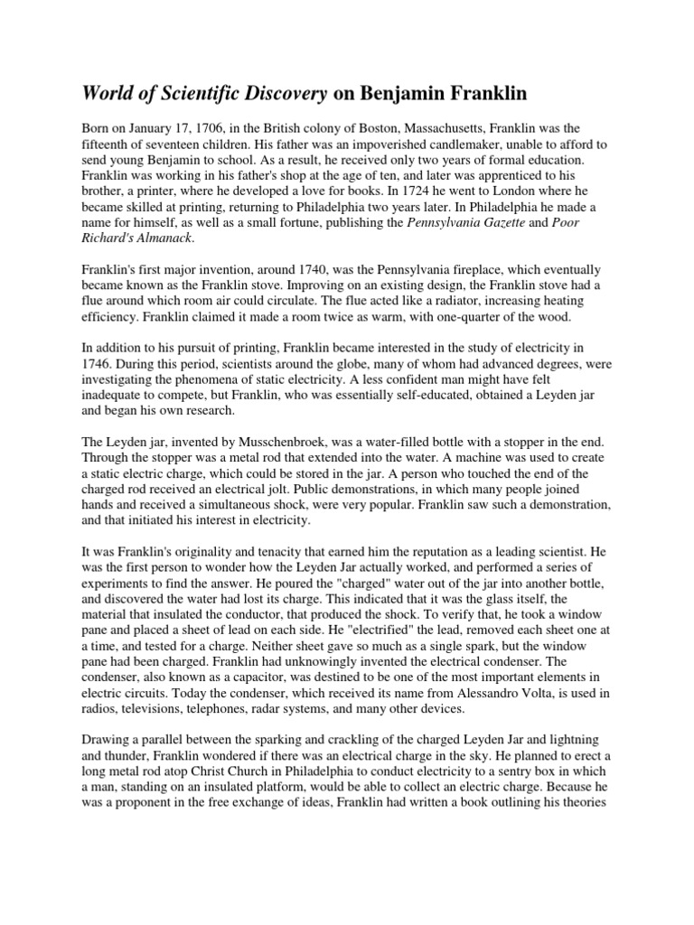 World Of Scientific Discovery On Benjamin Franklin Benjamin